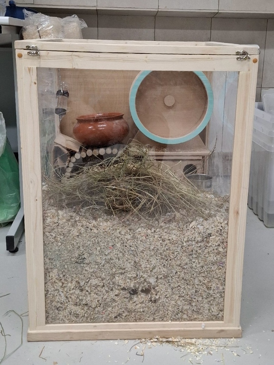 Заглянем под слой наполнителя песчанок. Пример использования табуреток и плоских домиков в качестве подставки под колесо, песочницу, миску и поилку. Слой наполнителя 40 см, высота витрины 80 см, хозяйка Екатерина Мурадян