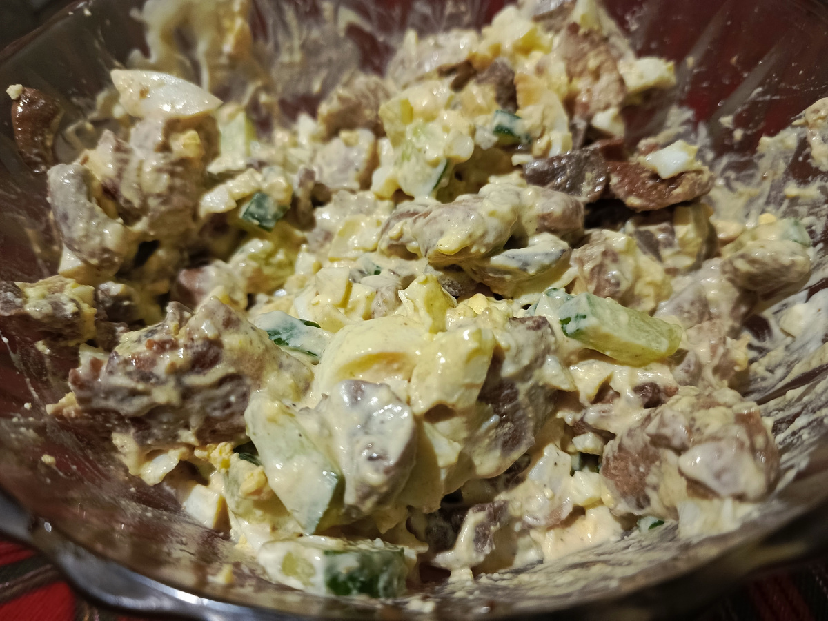 Обжариваем куриное филе со специями и нарезаем его на кубики, выкладываем в блюдо. К нему добавляем вареные яйца и огурцы. Можно взять и маринованные. Шампиньоны нарезаем кубиками и обжариваем. Добавляем грибы в салат.