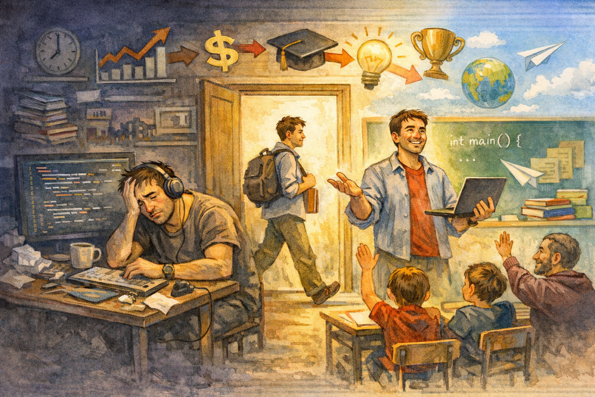 Я учитель информатики и математики по образованию. Но после выпуска в 2012 году (на самом деле даже в 2009) я пошёл в создание, поддержку и продвижение сайтов. Однако в 2018 году вернулся в преподавание, так как потерял смыслы в продвижении бизнеса и обрёл его в преподавании. Раньше я очень хотел научиться программировать. Поэтому я поступил на учителя информатики и математики и очень старался: читал книги, решал задачи по 10 часов подряд — и всё равно ничего не понимал. Чем больше старался, тем больше застревал. Думал: наверное, я тупой. Через напряжение, но всё-таки мне удалось освоить программирование и смежные области, чтобы участвовать в олимпиадах, даже во всемирном чемпионате по программированию среди студентов. А потом и начать создавать сайты за деньги. Однако всё равно это было трудно и тяжело, и я продолжал думать, что видимо, не для меня это и вот он, совсем близко мой потолок. Но потом я понял: дело не в том, что я тупой. В программировании, как в спорте — если напрягать в