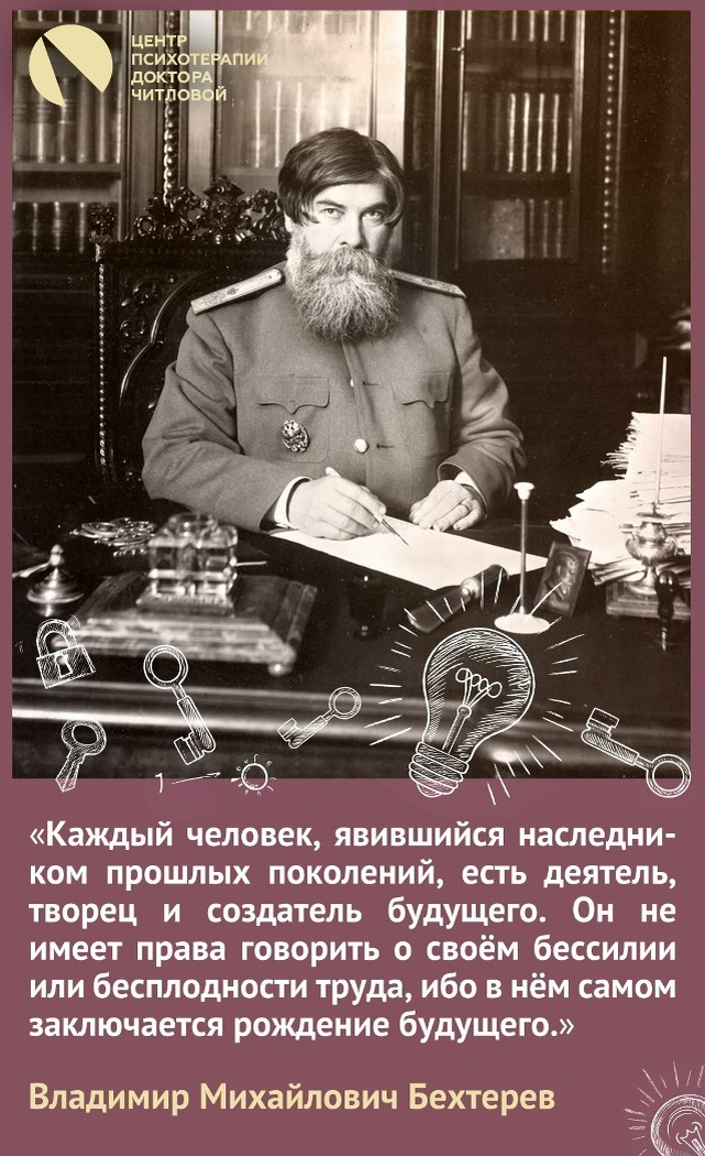 Мало кому известно, что великий отечественный ученый перенес острое психическое расстройство, после чего стал гениальным 1 февраля 1857 г родился великий российский ученый В.М. Бехтерев. Написала эту заметку, вдохновленная его неординарной личностью: “Вот смотришь порой на некоторых людей и невольно лезет мысль в голову: он наверное понял какую-то космическую формулу того, как жить счастливо, насыщенно и интересно.. Я про тех людей, которые много могут, хотят, успевают и создают нечто классное. Вот, к примеру, Леонардо да Винчи, или, приземленнее, - Том Форд, ну, первый кто вспомнился, - из таких красота сочится, они словно все на свете в голове связали и творят как проводники чего-то высшего... Я, вообще, про Бехтерева Владимира Михайловича поделиться хотела.