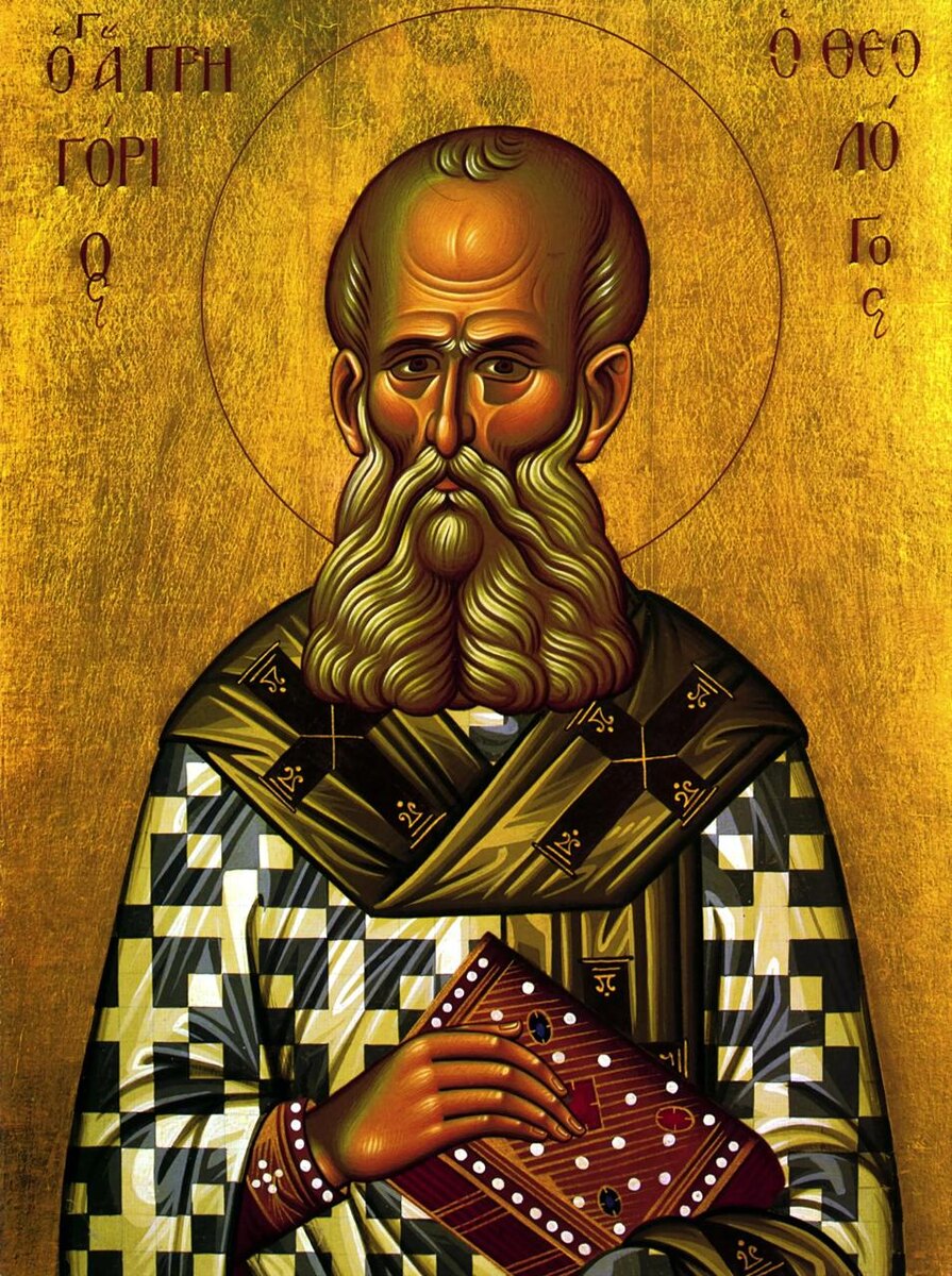 ) Па́мять и́же во святы́х отца́ на́шего Григо́рия Богосло́ва, патриа́рха Константи́ня гра́да Стихи́: Бо́жие позна́вати правосла́вне существо́ Христиа́ном рече́ся от Григо́рия: В два́десять пя́тый Григо́рие Богосло́вый у́мре. Вели́кий Григо́рий Богосло́в, наказа́тель и победи́тель, и учи́тель в свое́м житии́ быв. То́йже вели́каго Васи́лия и Григо́рия своего́ отца́, и бра́та своего́ Кеса́рия, и Горго́нию сестру́ свою́, словесы́ надгро́бными почте́. Те́мже и́же о нем не́цыи е́же списа́ша, не отъину́де, но от свои́х его́ слове́с взе́мше сказа́ша при́тчу. Толи́ко же еди́но рещи́ ну́жно, я́ко а́ще подоба́ше бы́ти в челове́цех о́браз не́кий, и столп по ча́сти, от всех сло́жен доброде́телей: сей бя́ше великий Григо́рий, житие́м у́бо све́тел, де́йствием же благоиску́сен. И толи́ко в боговиде́ние прии́де, я́ко всем покаря́тися прему́дрости его́, в словесе́х и в уче́ниих: тем и богосло́вия и́мя себе́ стяжа́в. Бя́ше же по о́бразу теле́сному, лице́м смире́н, блед вма́ле, ве́жди возведены́ и гу́ст