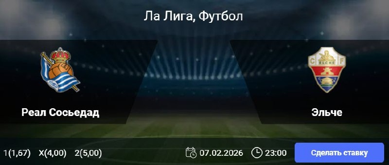 Статистика Реала Сосьедад: Статистические показатели свидетельствуют, что результативная серия команды в национальном первенстве достигла семи матчей. При этом в шести последних играх турнира оборона «Реал Сосьедада» не позволяла соперникам забить более одного гола. Также примечательно, что в семи предыдущих домашних встречах басков в Примере забивали обе стороны. Статистика Эльче: Анализ статистики показывает, что клуб удерживал фору (+1,5) в 8 из 11 последних матчей Ла Лиги. Атакующий потенциал команды на выезде ограничен: в семи из восьми предыдущих гостевых игр «Эльче» не забивал больше одного мяча. Кроме того, оборонительная линия допускает результативные ошибки на протяжении десяти выездных поединков подряд. 🎯 П1 🎲 кф (1,67) 👉 СДЕЛАТЬ СТАВКУ 🎁 ФРИБЕТ WINLINE - 3000₽ (промокод: BETWIN) 👉 СМОТРЕТЬ ПРОГНОЗ