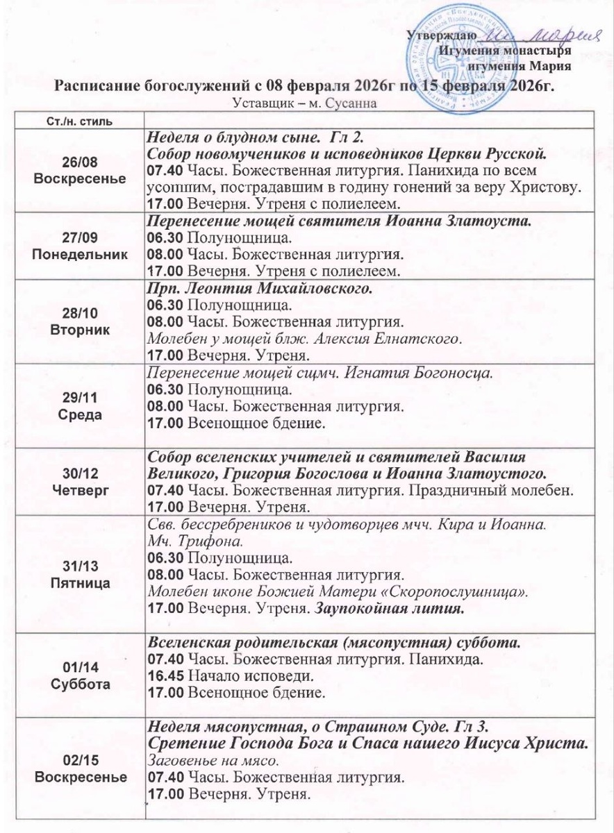 08-15.02. Расписание богослужений в Введенском женском монастыре г. Иваново