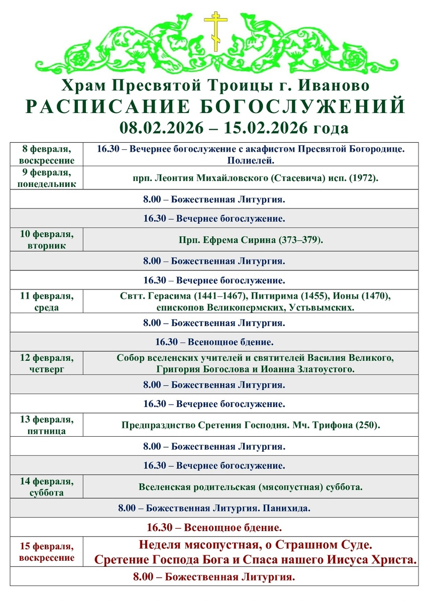 08-15.02. Расписание богослужений в Троицком храме г. Иваново