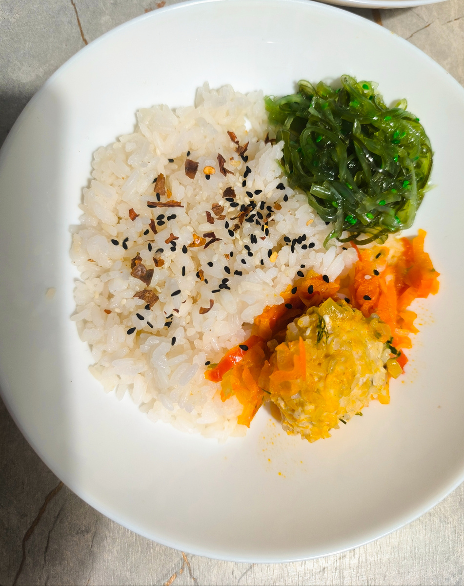 Вчерашний рис для поке, кунжут белый , чёрный, хлопья перца чили.Мясной ёжик с рисом.Салат из водорослей чука (никогда его не ела , всегда считала фу, но оказался очень даже ничего)