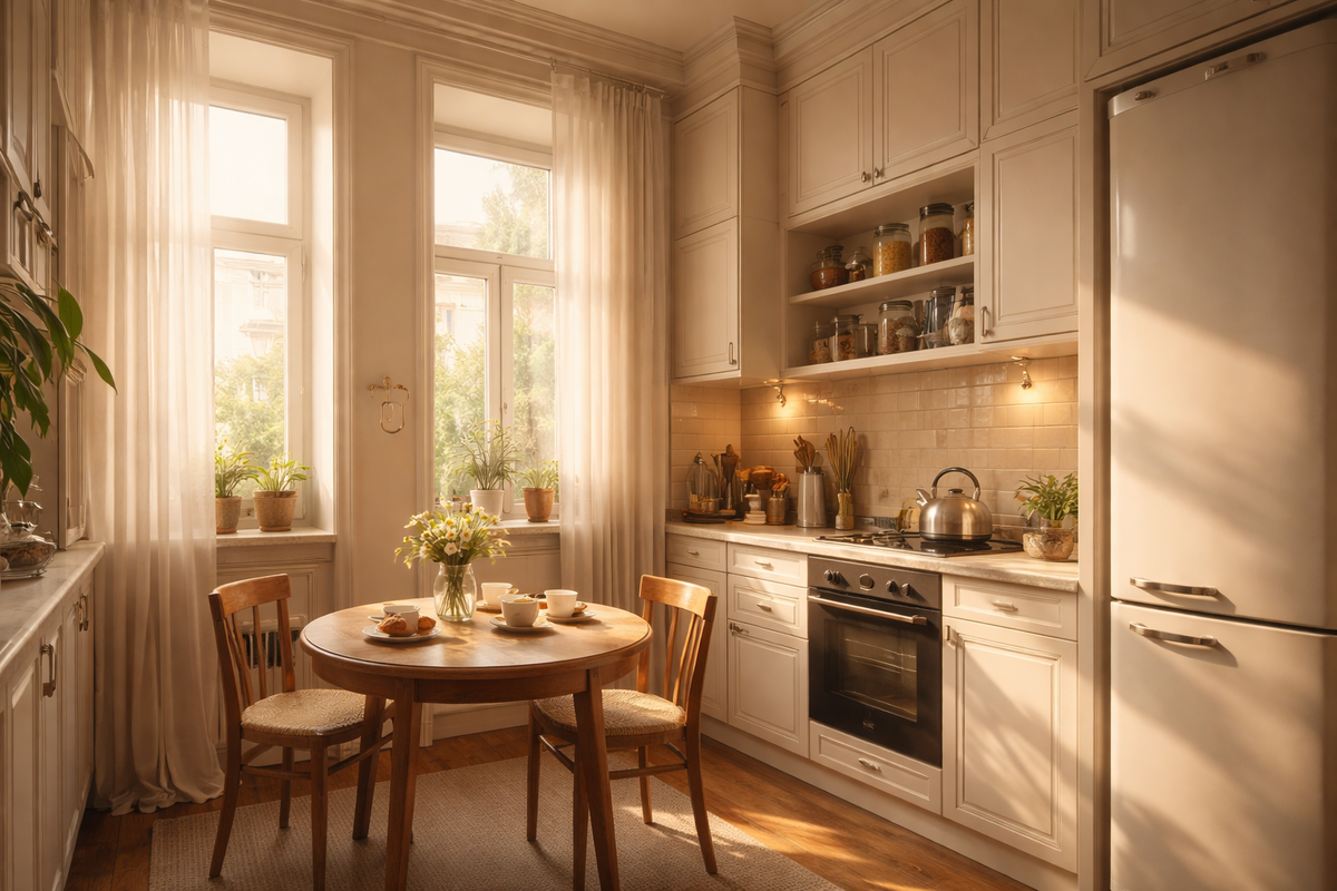 Сегодняшняя мода на огромные кухни-гостиные — это массовый психоз, который заставляет людей крушить несущие стены и превращать свои квартиры в подобие студий при отелях. Но давайте на минуту остановимся и подумаем… В сталинках кухни часто небольшие — восемь, девять, ну десять метров. И очень часто между кухней и комнатой стоит капитальная стена, которую законно не сдвинуть ни на сантиметр. Вместо того чтобы тратить годы на согласование незаконных перепланировок и рисковать прочностью дома, стоит просто научиться грамотно использовать то, что дали советские зодчие. Маленькая изолированная кухня — это на самом деле привилегия. Во-первых, это логистика запахов. Как бы круто ни работала ваша вытяжка, если вы жарите рыбу в объединенном пространстве, ваш диван в гостиной тоже будет пахнуть этой рыбой еще три дня. Во-вторых, это визуальный порядок. В изолированной кухне гора грязной посуды после ужина с друзьями не мозолит вам глаза, пока вы допиваете вино в гостиной. Вы просто закрываете две