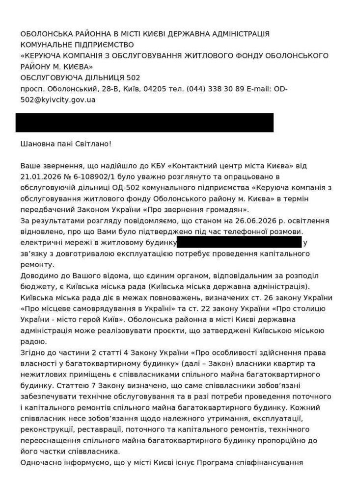 Управляющая компания Оболонского района Киева официально заявила, что жильцы многоквартирных домов обязаны за свой счет проводить капитальный ремонт электросетей, несмотря на регулярные аварии и пожароопасные ситуации в щитовых. Бывшие ЖЭКи ссылаются на то, что владельцы квартир являются «совладельцами общего имущества». Согласно этой логике, именно жильцы обязаны обеспечивать техническое обслуживание и оплачивать текущий или капитальный ремонт сетей. В одном из домов на Оболонском проспекте за месяц произошло три крупные аварии, в том числе с возгоранием щитовой. Однако коммунальщики отказались проводить ремонт за счет средств, которые жильцы платят за содержание дома. Жильцам предложили воспользоваться городской программой софинансирования. Однако в управляющей компании честно признали: рассмотрение заявки может занять несколько лет, а выполнение работ зависит от наличия средств в бюджете и приоритетности. Ранее мы писали, что более 200 тысяч жителей Харькова остаются без света