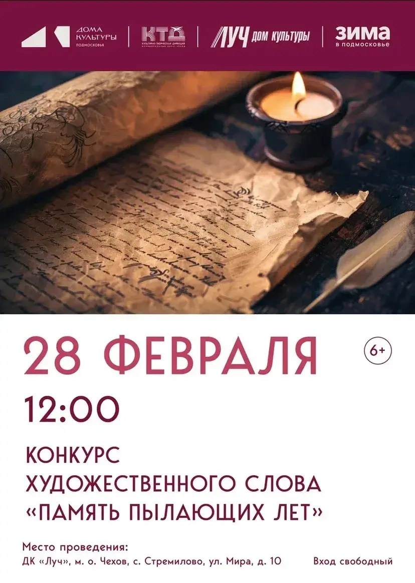 ! Участие бесплатное, заявки принимаются до 10 февраля по тел. +7 (910) 122-22-64. Присоединяйтесь к юным талантам⭐️ 📆 28.02.2026 🕛 12:00 🏢 ДК «Луч» 📍 г.о.Чехов, с.Стремилово, ул.Мира, стр.10 ⭐Поддержать канал голосом ✅ Мероприятия Чехов https://dzen.ru/id/66cc4b48e9ef144699238a51 http://vk.com/chekhov_events http://dzen.ru/chekhov_events
