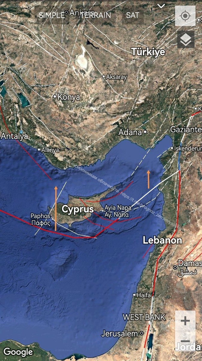 Наблюдается ОСТИ к северу от Кипра. По протяженности дотягивает до М6.0