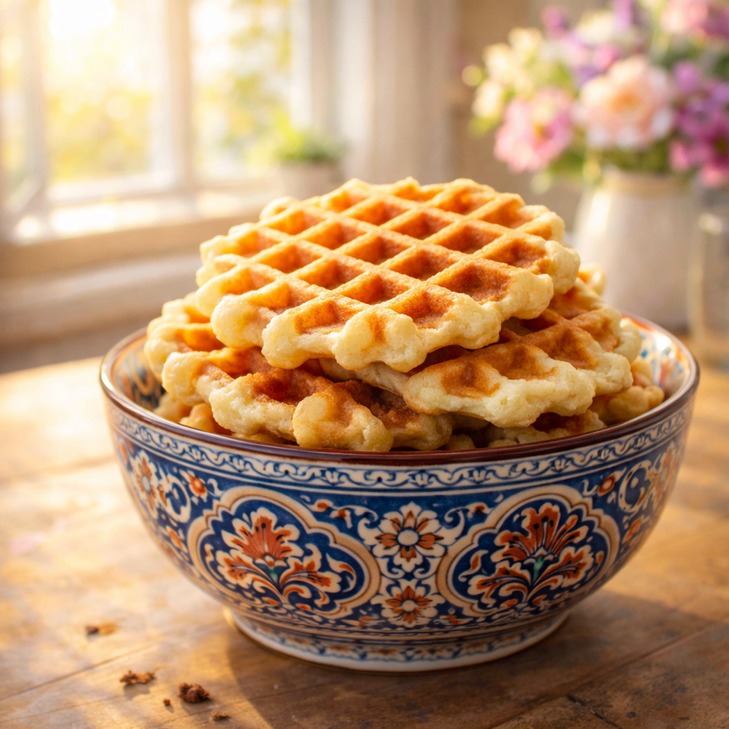 - Хорошо разогрейте вафельницу, слегка смажьте растительным маслом. Выпекайте вафли 3-5 минут.