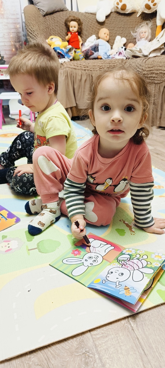 Большую часть времени играли двойняшки вдвоём в Амелькином кабинете (так коридорчик подписчица назвала). Притащила туда опять мат, чемоданчики все принесла с инструментами.