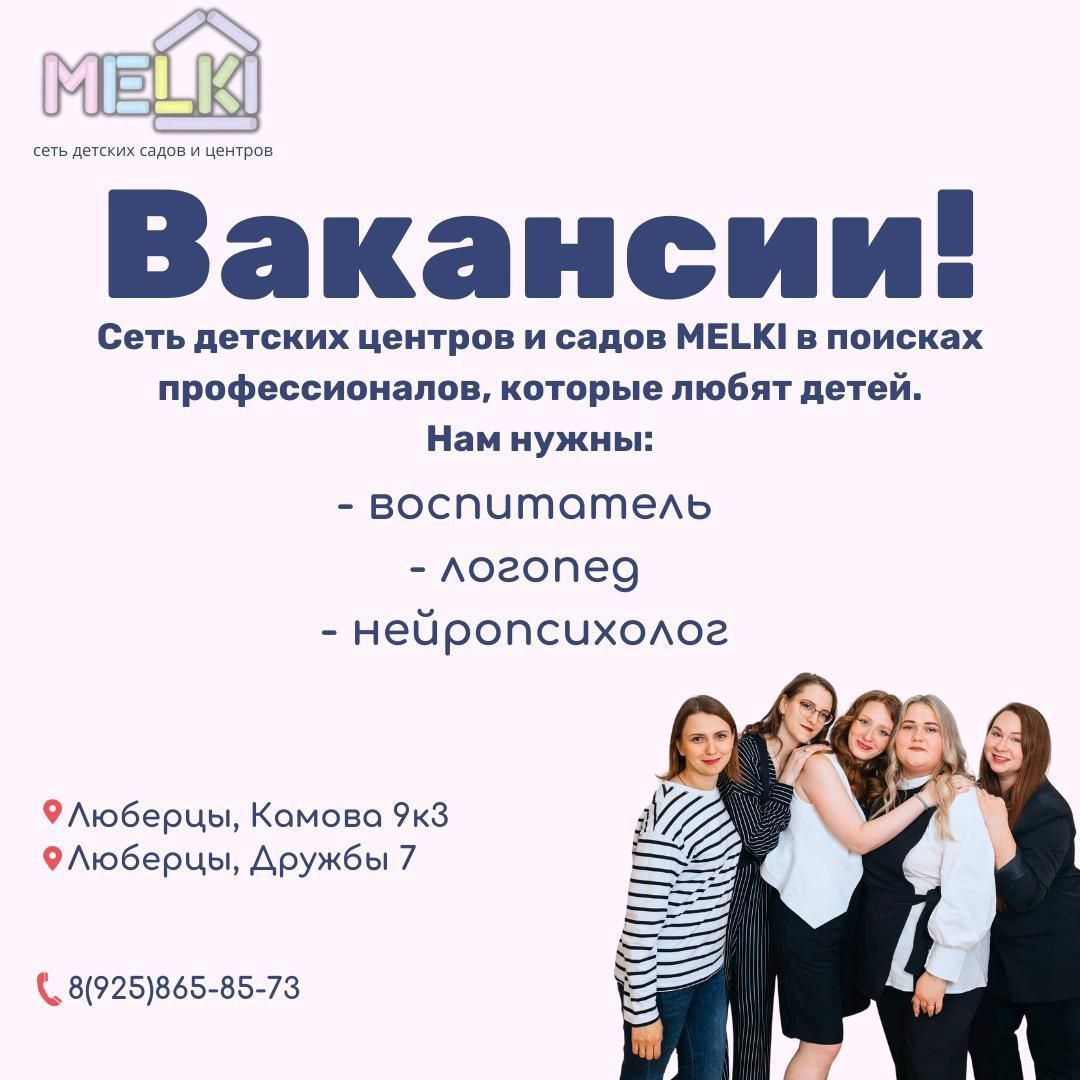 ! 🌟 Дорогие друзья! Мы расширяем нашу команду и ищем талантливых и увлеченных специалистов, готовых работать с детьми и помогать им развиваться! 🔍 Открытые вакансии: 1. Логопед – если вы обладаете опытом работы с детьми и готовы помочь им преодолеть речевые трудности. 2. Нейропсихолог – ищем профессионала, который поможет детям развивать когнитивные навыки и справляться с трудностями в обучении. 3. Воспитатель – если вы любите детей и хотите создать для них уютную и развивающую атмосферу. 💼 Что мы предлагаем: • Достойную зарплату • Уютный и дружелюбный коллектив • Возможности для профессионального роста • Комфортные условия работы 📩 Если вы хотите стать частью нашей команды, отправляйте резюме на почту: info@melkids.ru или звоните: +79258658573 Давайте вместе делать мир детей ярче и интереснее! 💖 #Melki #вакансии #логопед #нейропсихолог #воспитатель #работа #дети
