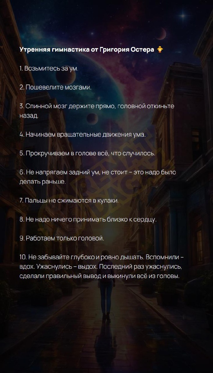 Возьмитесь за ум.... Утренняя гимнастика от Григория Остера ?? 1. Возьмитесь за ум. 2. Пошевелите мозгами. 3. Спинной мозг держите прямо, головной откиньте назад. 4. Начинаем вращательные движения ума. 5. Прокручиваем в голове всё, что случилось. 6. Не напрягаем задний ум, не стоит – это надо было делать раньше. 7. Пальцы не сжимаются в кулаки. 8. Не надо ничего принимать близко к сердцу. 9. Работаем только головой. 10. Не забывайте глубоко и ровно дышать. Вспомнили – вдох. Ужаснулись – выдох. Последний раз ужаснулись, сделали правильный вывод и выкинули всё из головы. Архитектура вашей души | Натальная карта T | VK | Pin | YouTub | Dzen #антистресс #ценности #ментальноездоровье #притяжение #верьвсебя #синхронность #свершение #ментальнаягигиена #здоровыйобразжизни #7число #7февраля