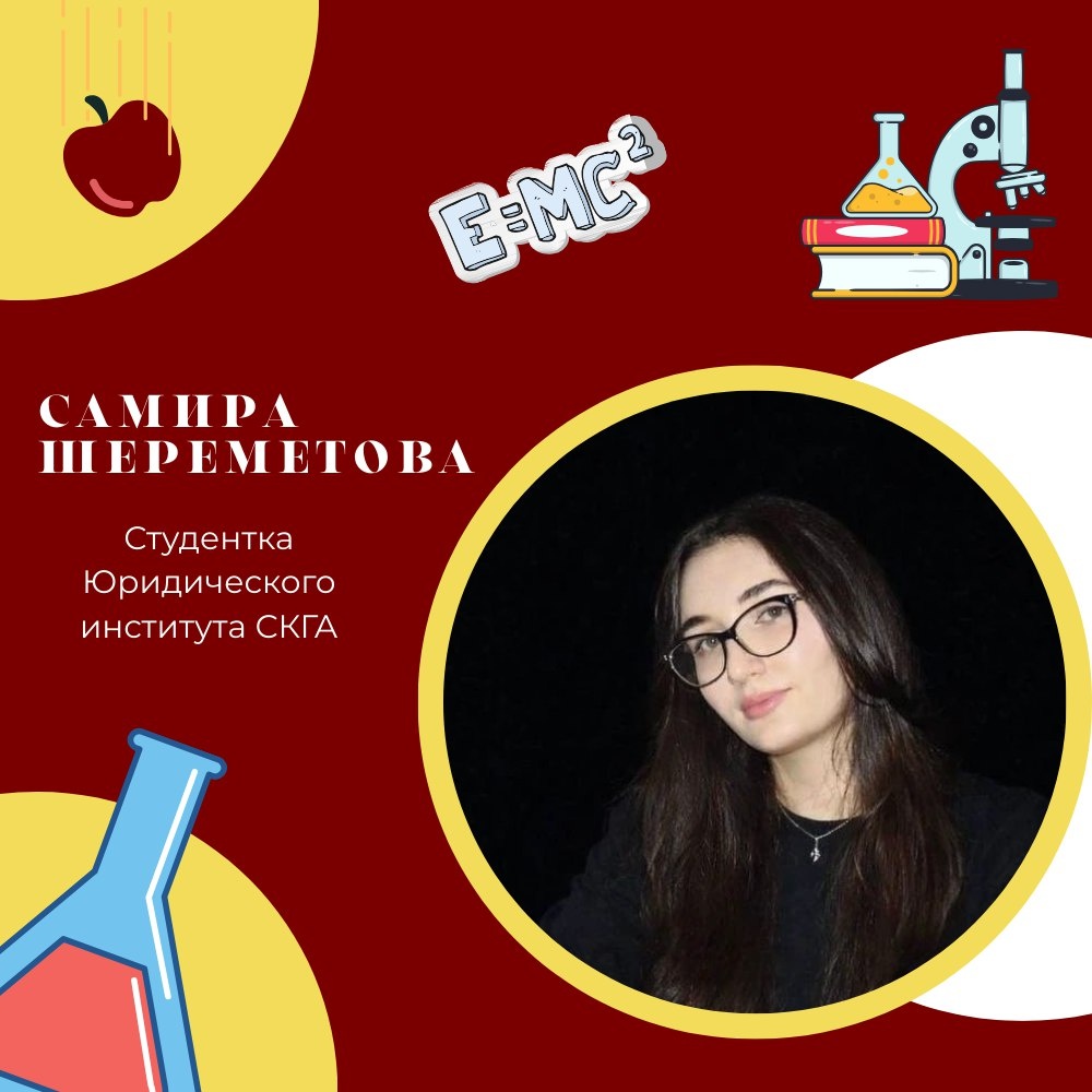 Шереметова Самира — студентка 4 курса Юридического института СКГА, которая уверенно проявляет себя в научной и конкурсной деятельности, выступая на площадках разного уровня — от олимпиад до форумов и конференций. Самира Зауровна показывает высокие результаты в профильных дисциплинах: она заняла 2 место во Всероссийской юридической олимпиаде Северо-Кавказского округа в номинации «Уголовное право», а также 2 место во Всероссийской олимпиаде по дисциплине «Гражданское право». Эти достижения подтверждают ее глубокую подготовку и системный подход к изучению права. 〽️Активность Самиры заметна и в научно-образовательных проектах: она принимала участие в 7-й Международной молодежной научно-практической конференции «Модель ООН в Крыму», во Всероссийской молодежной научной конференции «Фестиваль права», а также в образовательном этапе Парламентской модели МГИМО — проектах, которые развивают аналитическое мышление, навыки аргументации и публичных выступлений. Отдельно стоит отметить ее успехи