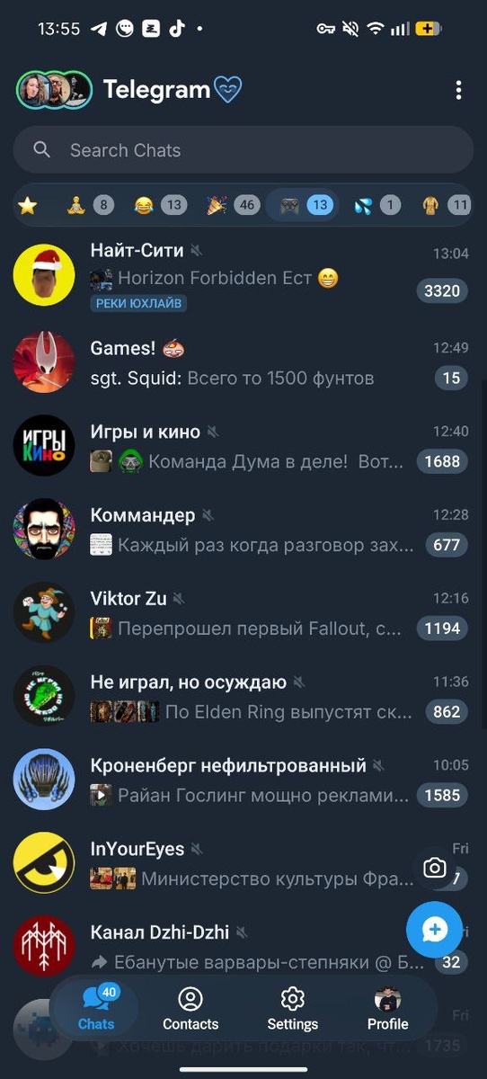 ) Если смотреть в шапку - хорошо решили сложную UX задачу: там и сторис, и поиск, и папки, все это понятно и удобно. Если смотреть в подвал - как будто там уже за 2 минуты хуйнули как у всех дженерик приложений, ну и унифицировали с iOS. Зачем в основной навигации отдельный раздел с контактами? Телеге уже 13 лет и с текущим функционалом вообще всем по барабану на записную книжку. Зачем там настройки и профиль? Просто сожрали пространство внизу. Особенно ярко чувствуется на контрасте с тем, как все это отлично лежало на своем месте раньше - на кладбище в гамбургер-меню.