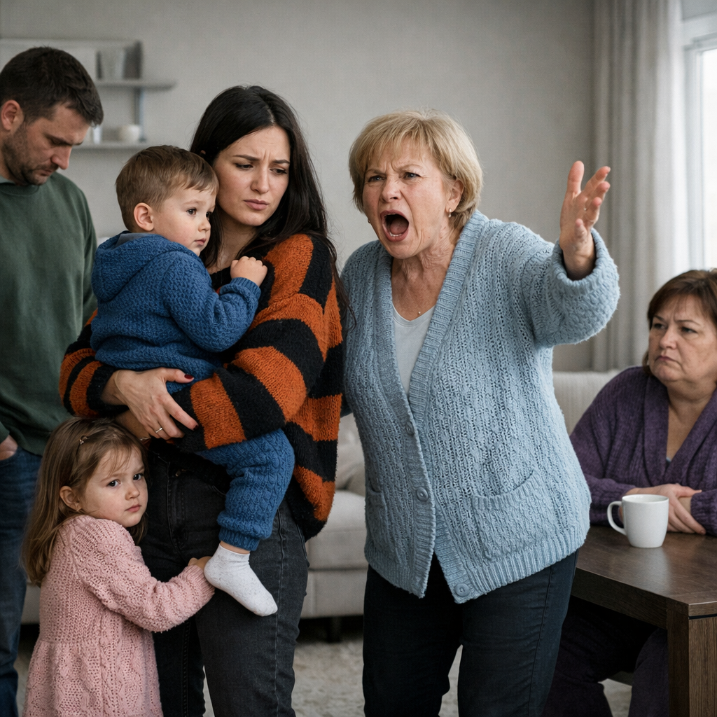 Варя прижалась к маминой ноге, её большие карие глаза испуганно смотрели на бабушку. Дима уже начал хныкать — он хотел есть и спать, и скандал его совсем не интересовал.