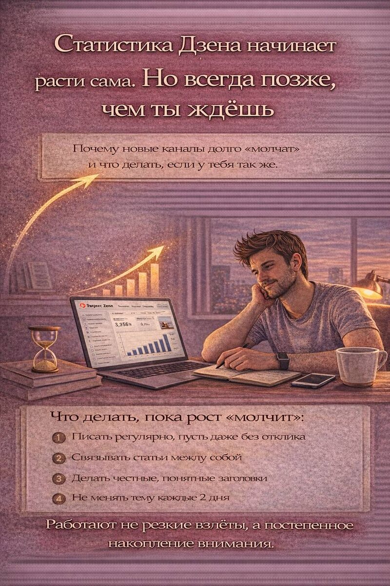 Если ты ведёшь канал в Дзене хотя бы пару недель, то почти наверняка ловил себя на мысли: «Ну когда уже начнёт расти?» «Я же стараюсь, пишу, выкладываю…» «Почему у других есть просмотры, а у меня — тишина?» Я тоже через это прохожу прямо сейчас. И вот что начинаю понимать. В начале кажется, что рост должен выглядеть так: Логично? Да. Работает так? Почти никогда. На практике всё происходит с сильной задержкой. И это нормально, хоть и очень бесит. Есть несколько причин, о которых редко говорят прямо. Первые статьи — это не рост, а проверка. Алгоритм Дзена: И только потом начинает давать шанс. Пока ты написал 3–5–10 статей, Дзен ещё не понимает: И он осторожничает. Это не наказание — это фильтр. Самое странное, что я заметил: статистика часто начинает расти не на свежих публикациях, а на тех, что были выложены раньше. Ты уже забыл про статью, а она вдруг: Именно поэтому важно не бросать. Вот момент, который я сейчас начинаю осознавать. Рост начинается тогда, когда: И это почти всегда прои