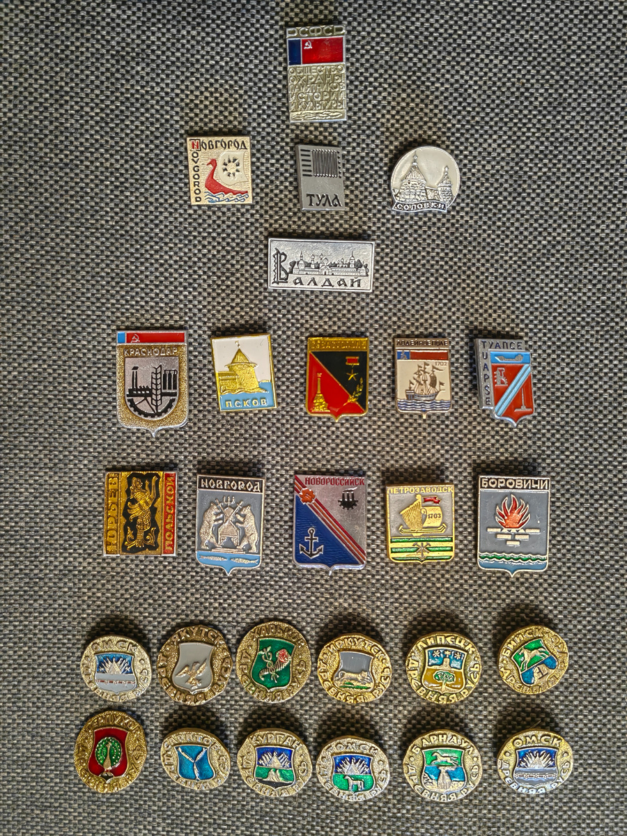 Сегодня мне сделали ценный подарок, передав в качестве дара коллекцию советских значков на разные темы. Напомню, что коллекционировать значки я начал совсем недавно со значка октябрёнка и без особого фанатизма - в настоящее время вырабатываю общую структуру возможной будущей (большой или не очень) коллекции. Пишу об этом иногда в своём блоге. Все заметки на эту тему можно увидеть в отдельной подборке. Так вот, 7 февраля коллекция пополнилась более чем на 150 значков (по-моему, 153 штуки, второй раз решил не пересчитывать). Я их предварительно структурировал на возможные темы - позже размещу в альбоме, который идёт из Китая второй месяц (доставка постоянно переносится), но я уже думаю, что куплю другой в Петербурге (смотрел на этот счёт кое-что). Темы подарка 1. Города России - это основная тема. Изначально я хотел иметь значки только тех городов, где был, но теперь буду стремиться посетить и те населённые пункты, значки которых у меня стали появляться (Соловки затесались случайно в эт