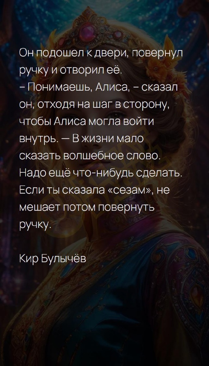 – Понимаешь, А... Он подошел к двери, повернул ручку и отворил её. – Понимаешь, Алиса, – сказал он, отходя на шаг в сторону, чтобы Алиса могла войти внутрь. — В жизни мало сказать волшебное слово. Надо ещё что-нибудь сделать. Если ты сказала «сезам», не мешает потом повернуть ручку. Кир Булычёв Архитектура вашей души | Натальная карта T | VK | Pin | YouTub | Dzen #гармониятела #психологияженщины #психологияженщины #бытьсобой #жизньпрекрасна #счастливаясемья #сценарийжизни #момент #вдохновение #7число #7февраля