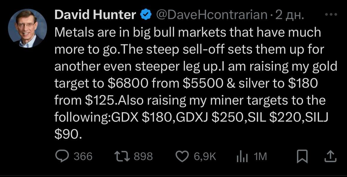 Золото по 6800$, Серебро по 180$? Недавний пост Девида Хантера - главного макростратега Contrarian Macro Advisors 52 года на Уолл-стрит, сначала в качестве институционального портфельного менеджера, а затем в качестве макростратега. "Металлы находятся в фазе сильного бычьего рынка, и у них еще большой потенциал роста. Резкое падение цен создает предпосылки для еще более резкого подъема. Я повышаю свою целевую цену на золото с 5500 до 6800 долларов, а на серебро со 125 до 180 долларов." Инвестиции в Золото, Серебро. Акции, Gold ETF, GLDRUB_TOM, Cлитки и монеты. Купить золото и другие драгметаллы на Мосбирже.