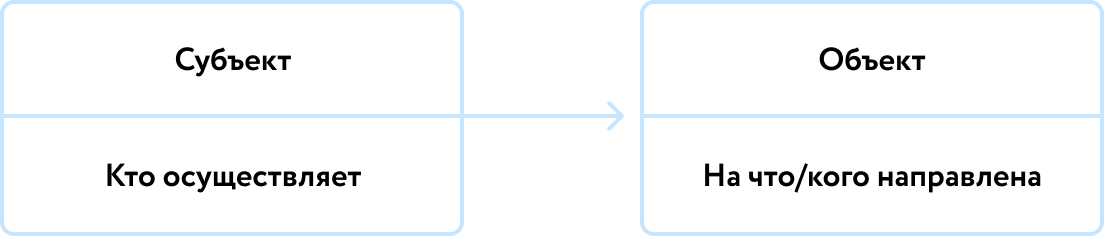 Прежде всего, она предполагает, что есть две стороны, — субъект, то есть тот, кто действует, и объект, то есть то, на что или на кого воздействует субъект.