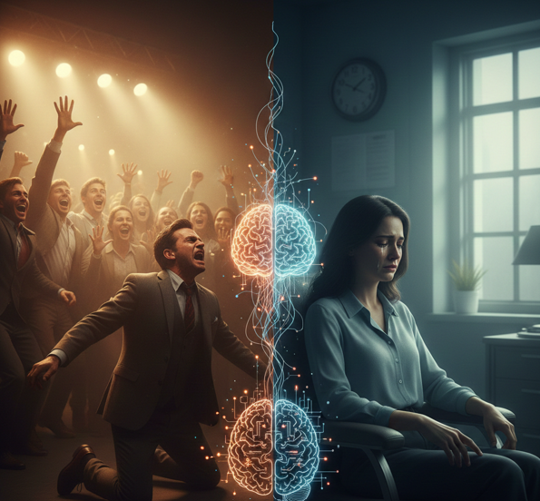 Входные данные: на тебя смотрит тысяча глаз. Ты в центре внимания. Ведущий, который сейчас — вожак стаи, дает команду. И тут включается древний скрипт выживания: не спорь с вожаком, делай что говорят, иначе стая тебя выбросит. Человек подчиняется не силе мысли. Он подчиняется страху стать изгоем.