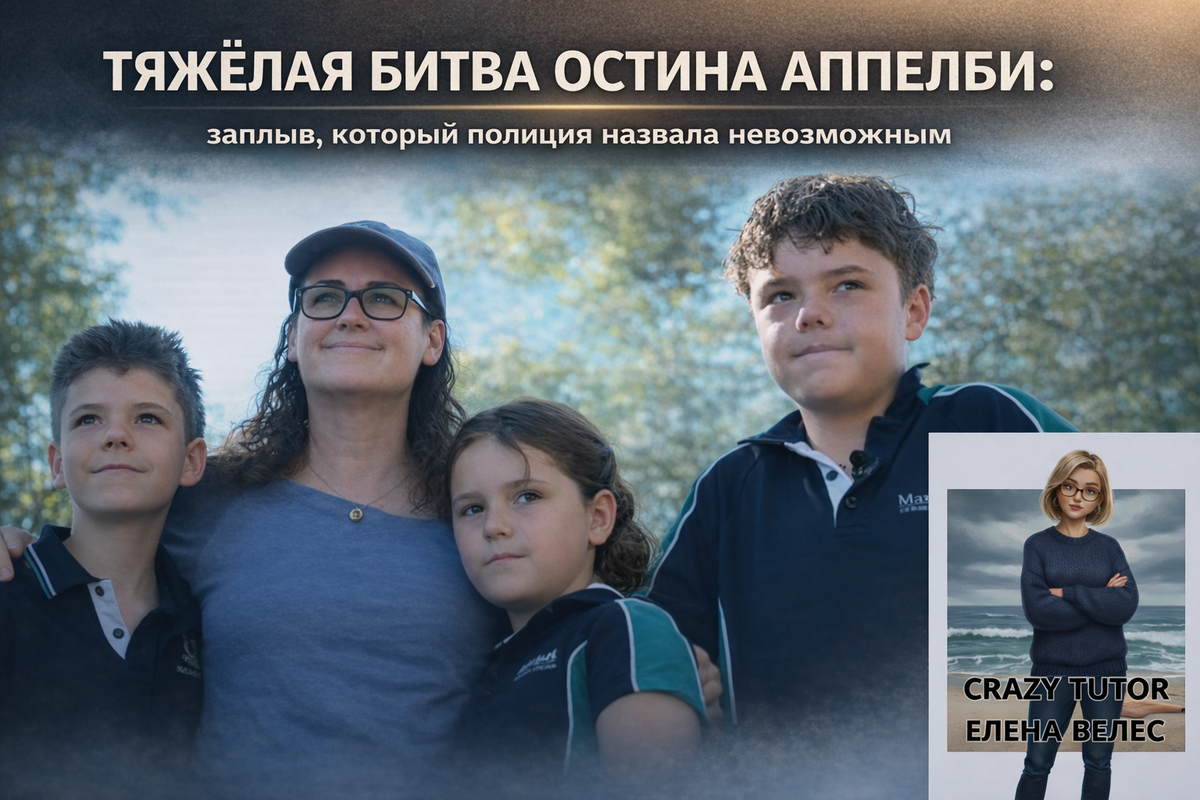 Привет! На связи Елена Велес, твой Crazy Tutor. Слушай, я только что прочитала эту историю, и у меня буквально мурашки по коже. Мы расстраиваемся из-за неправильного глагола или когда перепутали Active и Passive, а этот парень в 13 лет показал всему миру, что такое настоящий характер и стальные нервы. Сегодня я познакомлю вас с Остином — мальчиком, который решил, что океан ему не указ, когда на кону жизнь его близких. Это не просто новость, это настоящий урок того, на что способен человек, когда у него есть цель и бесконечная любовь в сердце . Остин Аппелби провел долгие часы в открытом море, борясь за жизнь, не зная, увидит ли он когда-нибудь свою маму Джоан, брата Бо и сестру Грейс живыми. Всё началось как обычный семейный выходной в заливе Квиндалуп. Семья наслаждалась солнцем с каяком и двумя паддлбордами на мелководье. Но океан коварен: ветер резко усилился, и течение начало стремительно уносить их от берега. «Всё пошло наперекосяк очень быстро», — вспоминает Джоан. Они потеряли