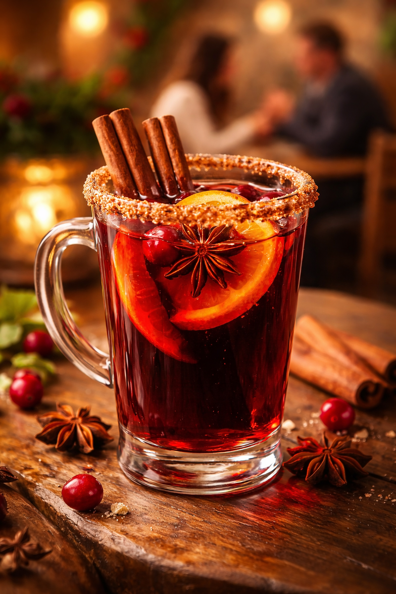 - Готовый глинтвейн можно разлить в термокружки и отправиться на прогулку. Или подать в красивых стаканах, украсив обод коричневым сахаром и положив по колечку мандарина и по палочке корицы в каждый.