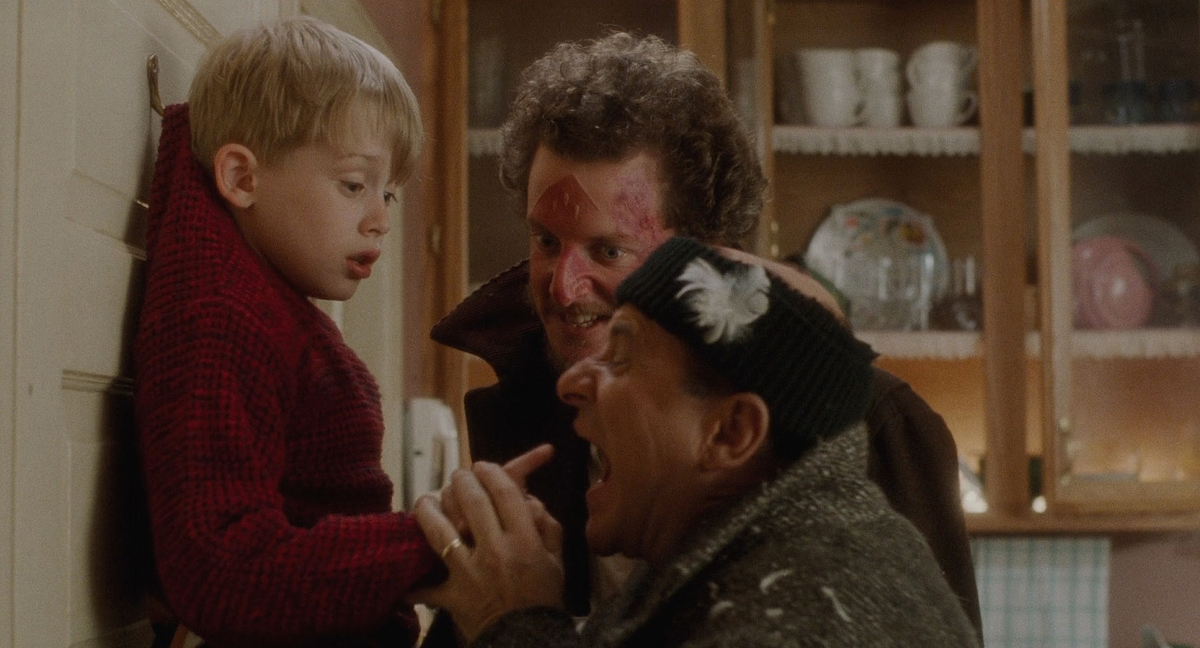 Актёр Джо Пеши, известный по ролям крутых парней у Скорсезе, очень переживал, что его грубый голос и резкие действия во время съёмок сцен «избиения» могут напугать 10-летнего Маколея. После каждого душа с криками и падениями он подходил к мальчику и ласково спрашивал: «Всё хорошо, приятель? Ты в порядке?». Маколей Калкин, в свою очередь, вспоминал, что Пеши и Дэниел Стерн (Марв) были для него как «крутые дядьки», которые его обожали и постоянно дурачились за кадром. Эта дружеская атмосфера помогла сделать экранное противостояние смешным, а не по-настоящему пугающим.