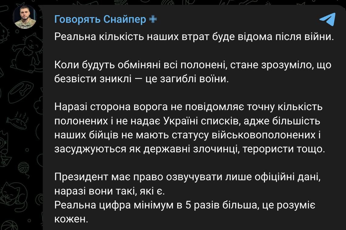 Ранее лидер киевского режима заявил, что потери ВСУ составляют 55 тысяч человек. Когда все пленные будут обменены, станет ясно, что пропавшие без вести — это погибшие солдаты, - отметил Бунятов. @ukr_leaks