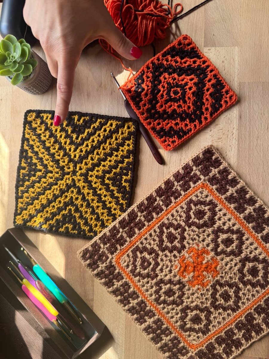 Итак, именно техническая разница в провязывании центра. Передаю привет моей подписчице из ВК Яне, которая вяжет центр контрастным цветом, когда это нужно для рисунка. Можно начинать квадрат не с восьми столбиков без накида, а с четырех. В этом случае вяжем эти четыре столбика в кольцо одним цветом, а следующий ряд уже другим: провязываем по два столбика без накида в каждую петлю. В итоге получаем восемь столбиков и далее уже от них движемся по схеме. Итог: центр мотива — по сути точка в полотне — вывязан контрастным цветом . Это особенно актуально для рисунков с повторяющимися элементами, один из который расположен в самом центре и не хочется, чтобы он отличался от других.