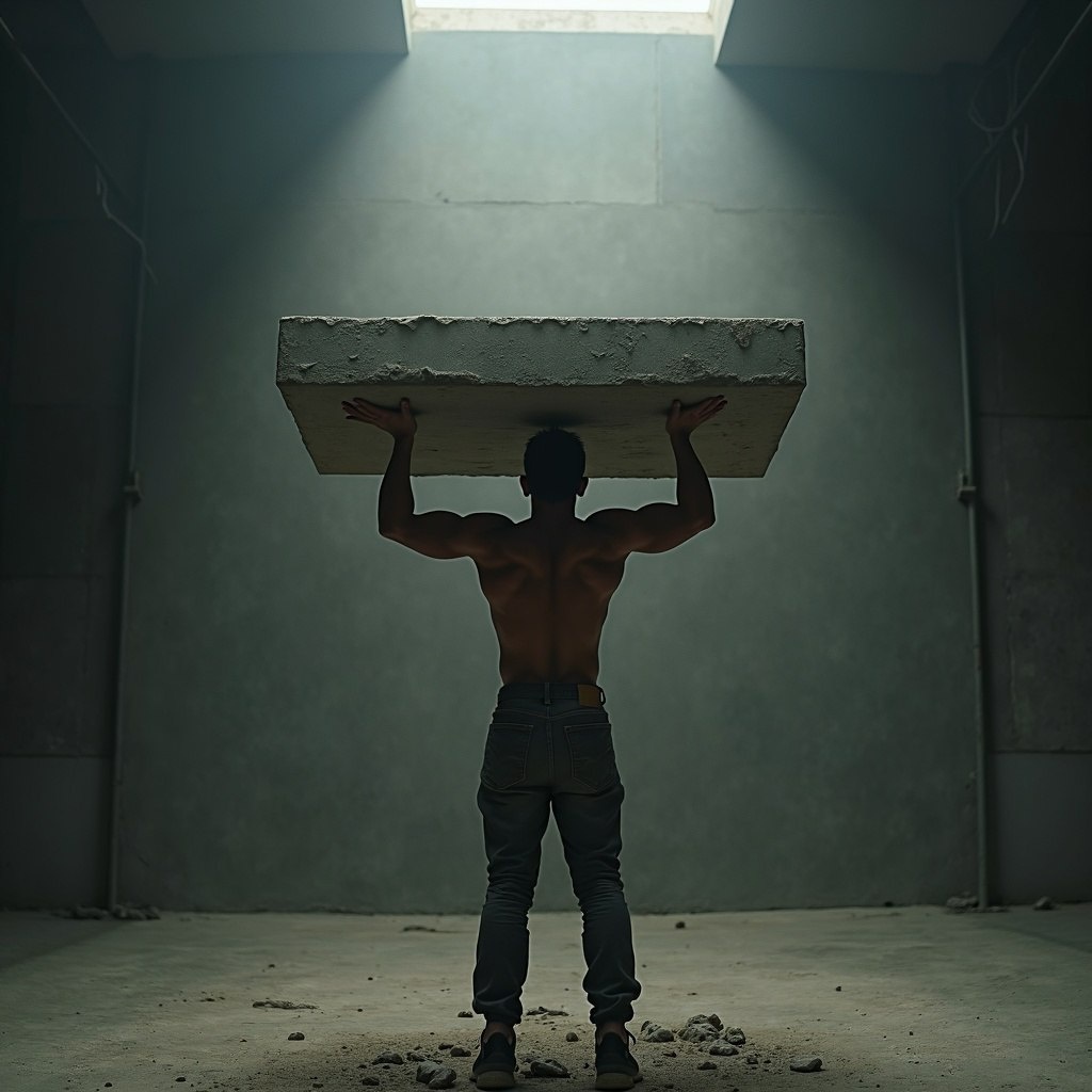 Он тратит сверхусилия, чтобы плита не придавила окончательно. Он верит, что свобода наступит после последнего платежа.