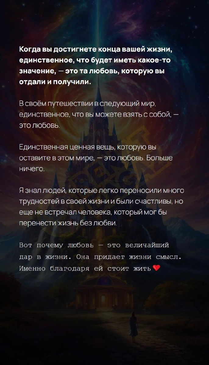 Когда вы достигнете конца вашей жизни, единственное, что будет иметь какое-то значение, — это та любовь, которую вы отдали и получили. В своём путешествии в следующий мир, единственное, что вы можете взять с собой, — это любовь. Единственная ценная вещь, которую вы оставите в этом мире, — это любовь. Больше ничего. Я знал людей, которые легко переносили много трудностей в своей жизни и были счастливы, но еще не встречал человека, который мог бы перенести жизнь без любви. Вот почему любовь — это величайший дар в жизни. Она придает жизни смысл. Именно благодаря ей стоит жить?? Архитектура вашей души | Архитектура вашей души T | VK | Pin | YouTub | Dzen #кодсчастья #приоритеты #ценности #впотоке #духовныепрактики #перепрошивка #ресурс #начало #проводник #7число #7февраля