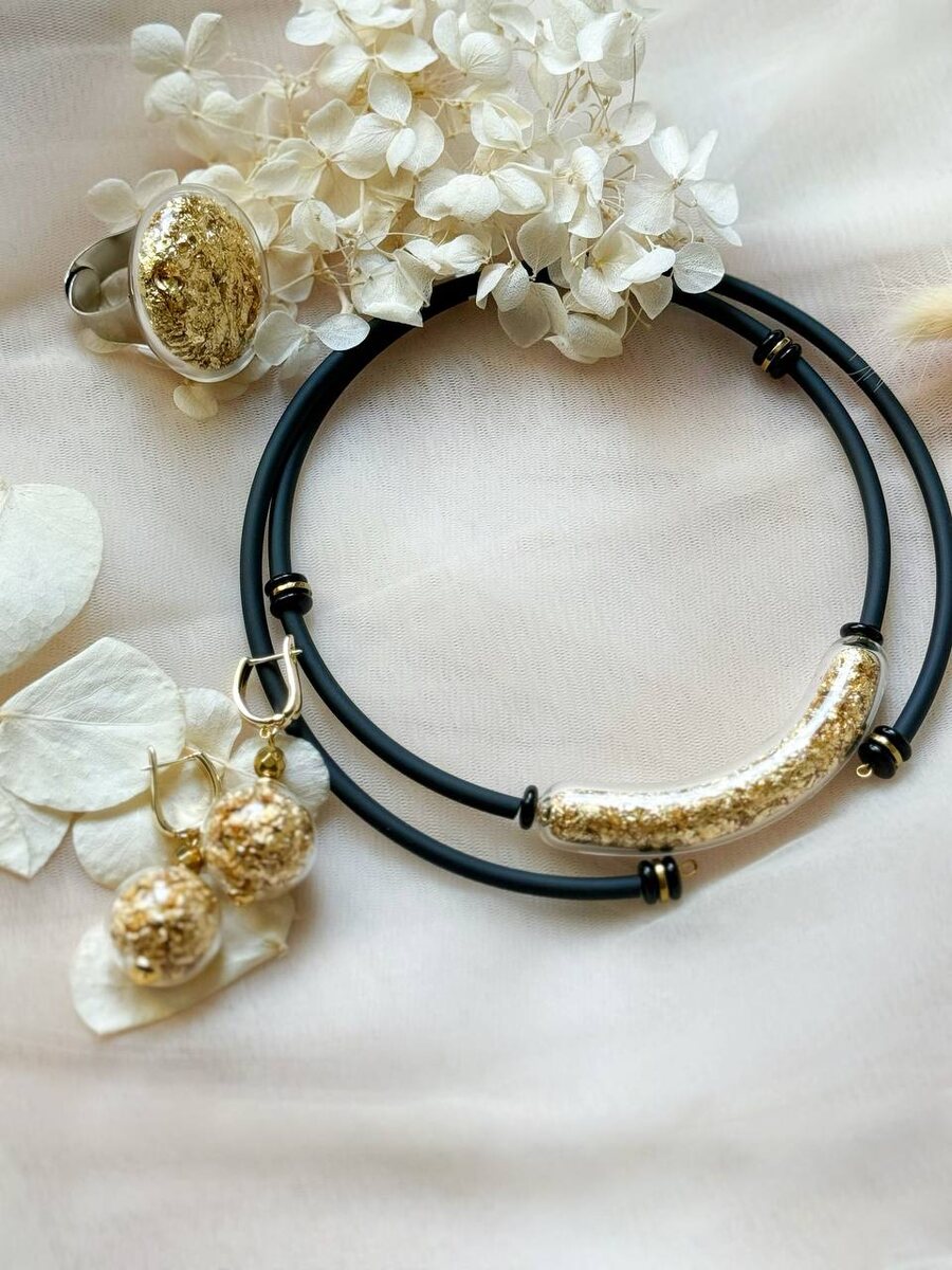 ⚜️ Украшения с сусальным золотом внутри прозрачного стекла — это союз античных традиций и современного дизайна. Тончайшие золотые хлопья словно парят в невесомости, создавая неповторимое мерцание при каждом движении. Этот благородный блеск в сочетании с черным каучуком выглядит стильно и дорого, превращая украшения в центральный акцент любого образа. Золото в стекле не тускнеет и сохраняет свою первозданную роскошь десятилетиями, оставаясь вне времени и мимолетных трендов.🪄 Колье 3900 Серьги 3600 Кольцо 4200 ✨Нажмите для заказа ✉️ Нажмите чтобы задать вопрос