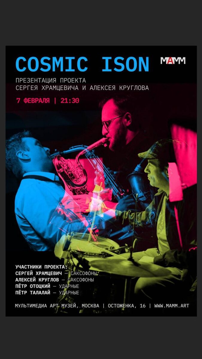 самых представительных музеев России — Московского Мультимедиа Арт Музея, где и играем вечером. Сергей, наряду с Алёшей Кругловым, является одним из самых глубоких, активных и актуальных импровизаторов на московской сцене. Коснулись наших духовных воззрений – искушения и собственного эго, а также доверия Воле Божьей, и о том, как удостовериться в её подлинности. Высказанная Серёжей подспудная цель вечернего концерта – повлиять на аудиторию с помощью музыки, аналогичной натуральному развивающейся как молитвенное бдение и, в идеале, кому-то из зрителей напомнить о плюсах посещения православной церковной литургии кажется мне достойной целью: отсоединиться от попытки играть собственное эго и стать ретранслятором чего-то большего. Билеты дорогие: https://mamm-mdf.ru/events/detail/prezentatsiya-proekta-cosmic-ison-sergeya-khramtsevicha-i-alekseya-kruglova/ #сталалаем