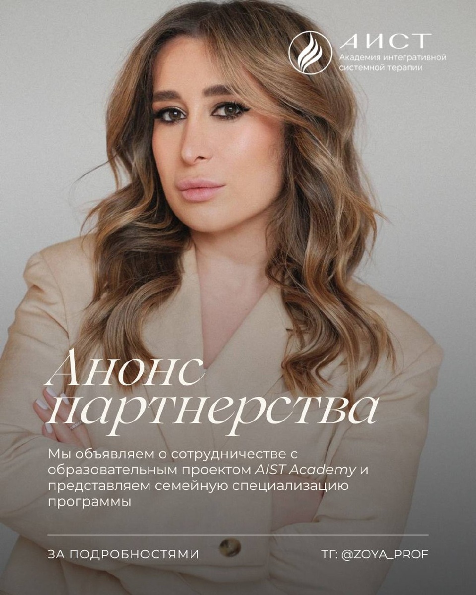 Подробнее о программе: https://aist-academy.ru/family#rec810778053 В рамках этого партнерства для нашей аудитории предусмотрены специальные условия участия. По промокоду «AIST» предоставляется скидка 15% – ежемесячная стоимость обучения составит 15.000 рублей вместо 20.000 рублей. Семейная специализация AIST Academy – это глубокая профессиональная программа, ориентированная на практическую работу с семьями и парами, системное мышление и устойчивые терапевтические результаты. ▫️Нигина Сулаймани является супервизором программы с нашей стороны и сопровождает образовательный процесс, обеспечивая высокий профессиональный уровень обучения. По всем вопросам участия и условиям обучения: Ольга – @ZOYA_Prof