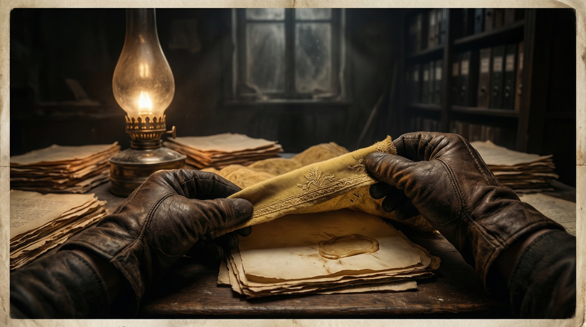 Вдруг среди вороха бумаг — платок. Не из тех, что носят нынче. Тонкий, с вышивкой по краю, а в углу — инициалы «А.В.». Я поднял его, поднёс к свету. Ткань пожелтела, но узор ещё читался.