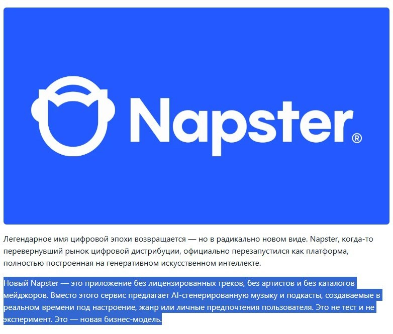 Легендарное имя цифровой эпохи возвращается — но в радикально новом виде. Napster, когда-то перевернувший рынок цифровой дистрибуции, официально перезапустился как платформа, полностью построенная на генеративном искусственном интеллекте. Новый Napster — это приложение без лицензированных треков, без артистов и без каталогов мейджоров. Вместо этого сервис предлагает AI-сгенерированную музыку и подкасты, создаваемые в реальном времени под настроение, жанр или личные предпочтения пользователя. Это не тест и не эксперимент. Это — новая бизнес-модель. На фоне растущего количества AI-треков в чартах стримингов и появления AI-треков в плейлистах эфирных радиостанций и удаления каталогов AI-музыки из Deezer и прочих стримингов - это именно то, что нужно сегодня и сейчас, и то, во что превратится Яндекс Музыка завтра. Только Яндекс рискует уничтожить всю индустрию легальной музыки, если не предпримет решительных и срочных действий. Подобный стриминг уже работает, как соцсеть внутри AI-генера