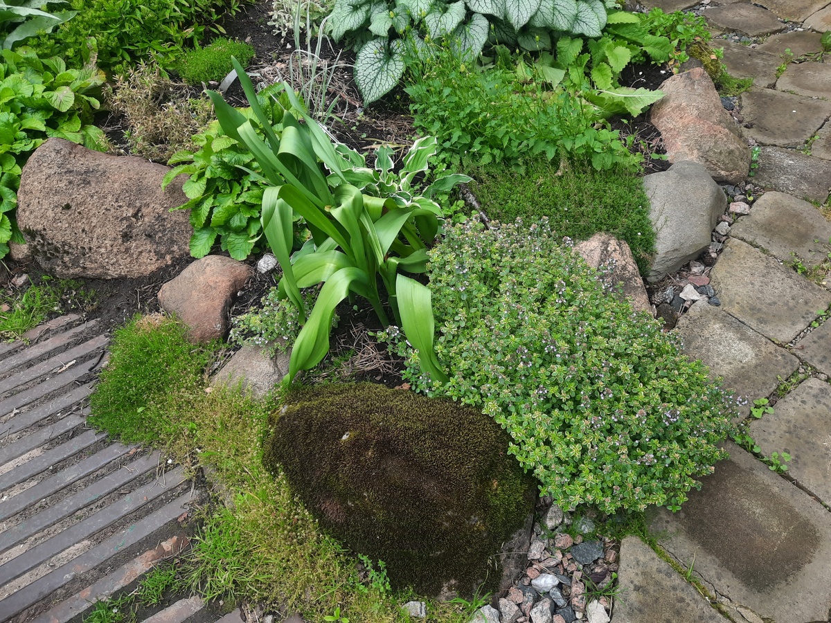 Итак, продолжение белого банкета! Много чего меняется в цветнике в июле и августе. База остается, а детали разные. Многие растения значительно разрастаются, что добавляет цветнику законченности. Не везде. местами. Формирование таких цветников может идти по двум путям. Изучаешь предложение, закупаешь все, что наметила, получаешь и высаживаешь. Не факт, что все будет так, как на картинке. Удовольствия и удовлетворения минимум. Или год за годом подбираешь то, что нравится, что отлично растет в твоих условиях, не требует излишнего участия. Итак, в путь! В июль! Обращаем внимание на то, как разросся вариегатный чабрец. Цветут астранция, ясенец и инкарвиллея Делавея. Астильба в очереди! А медуница, гляньте, как размахалась листочками! Как вам герань? Нежный розовый еле заметный оттенок меня не смущает! Она разрослась, заняла отведенное ей место. может и еще чуток рабежаться. И будет так, как будто само выросло! С ясенцом они нормально смотрятся. Чуть в сторонке астранция в полном роспуск