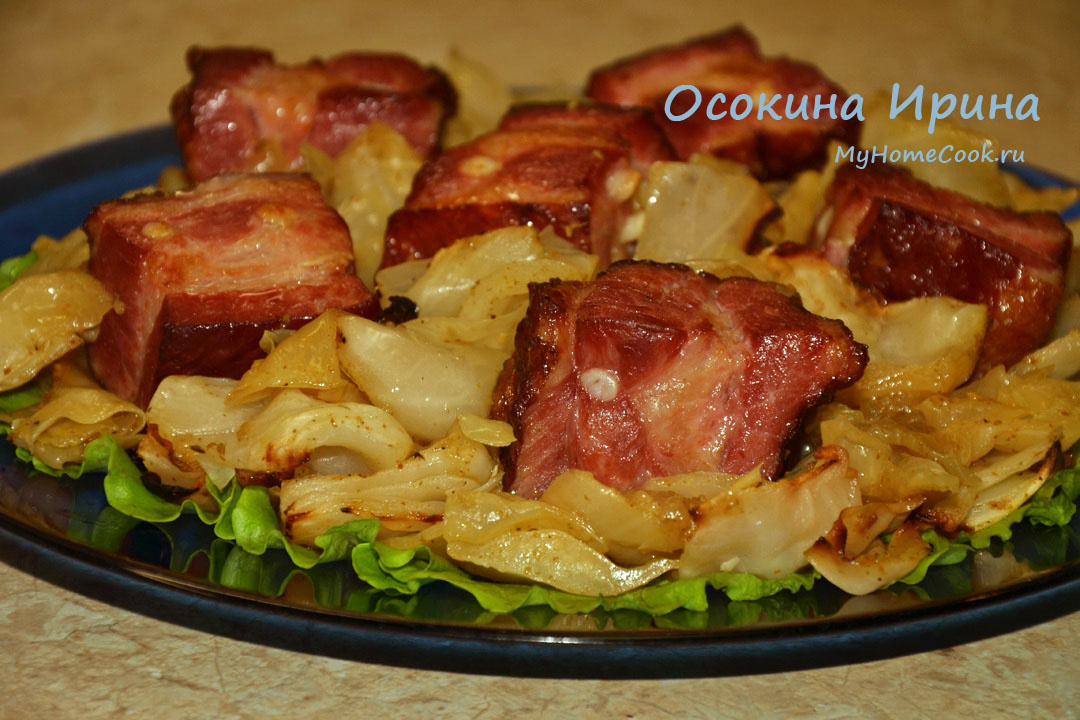 Не особенно жалую покупные копчёности, но супруг любит и приходится его иногда баловать. Но тут я играю на сочетаниях - только с овощами, никаких круп и картошки. Не всегда получается, но сегодня всё сложилось идеально: толстенькую ленту копчёных свиных рёбрышек разрезала на крупные квадраты, обжарила в сотейнике на небольшом количестве растительного масла и переложила в форму для запекания. В оставшемся масле быстро обжарила 2/3 кочанчика капусты крупными шашечками с добавлением 1 ч.л. смеси пряностей для капусты, переложила в форму к рёбрам, положила форму в пакет для запекания, завязала его его и запекла всё в духовке, разогретой до 180 градусов, в течение 60 минут. Просто и ооочень вкусно) Приятного аппетита