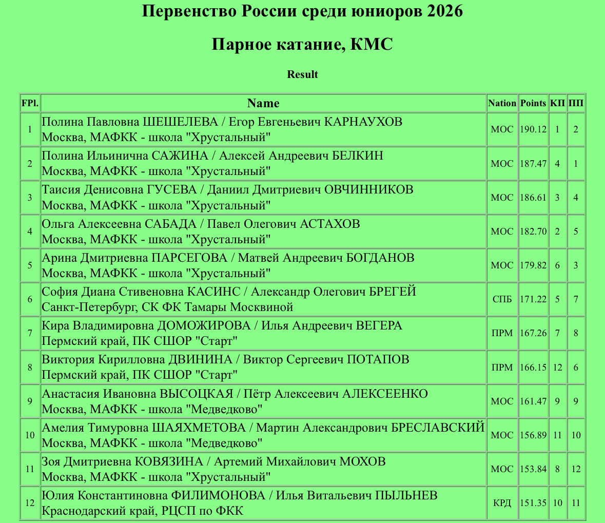 Чистейший четверной выброс! Очень легко и красиво. Зачем же потом было падать с риттбергера и срывать вращение? Потерли огромное количество баллов и не смогли побороться за место на пьедестале. 114.57, 182.70, четвёртое место. По итогам Первенства России Оля и Паша отбираются в юниорскую сборную России. Молодцы!