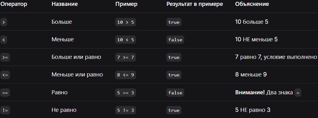 Привет! В прошлой статье мы научили программу принимать решения с помощью if-else. Помнишь условие if (wallet >= pizzaPrice)? Символы >= — это операторы сравнения. Без них любое условие бессмысленно — программа не сможет понять, «жарко» на улице или «холодно», «достаточно» ли денег. Сегодня мы разберём все операторы сравнения и логические операторы, которые связывают их в сложные условия. Цель урока: Научиться правильно записывать условия для if, while и for с помощью операторов сравнения. Операторы сравнения — это специальные символы, которые сравнивают два значения и возвращают результат: true (истина) или false (ложь). Именно этот результат (true/false) и проверяет оператор if. Представь, что ты спрашиваешь у программы: Давай соберём их все в одну таблицу. Запомни: результат ВСЕГДА boolean (true или false). Критически важный момент: Самый быстрый способ понять — попробовать. В нашем классе Main введи переменные и поэкспериментируй. Обрати внимание на строку 12. Скобки вокруг (myA