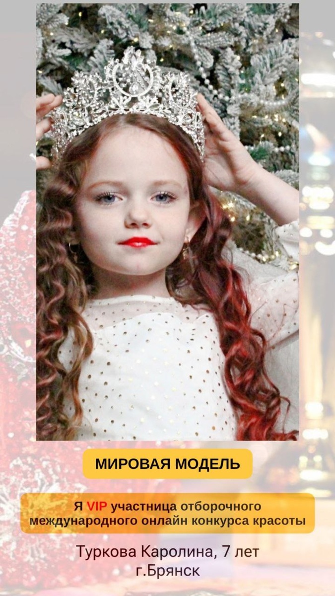‼️ Представляем вам участников 8-го сезона отборочного онлайн-конкурса красоты "МИРОВАЯ МОДЕЛЬ"! ЗВЁЗДНЫЙ УЧАСТНИК💫 Каролина занимается образцовой Театр моды "Мода как искусство" Г.Брянск, с 4 лет руководитель - Суржик Элина Викторовна. Номинация "Маленькая Мисс модель", Номинация "Моно костюм" Гран-при, Международный конкурс "Звёздное сияние" Гран-при, Номинация "Дефиле" Гран-при, Лауреат 2 степени "Бьюти портрет" 🏆Скоро вы меня увидите на финале конкурса красоты «Мировая модель» Москва с 2-4 мая