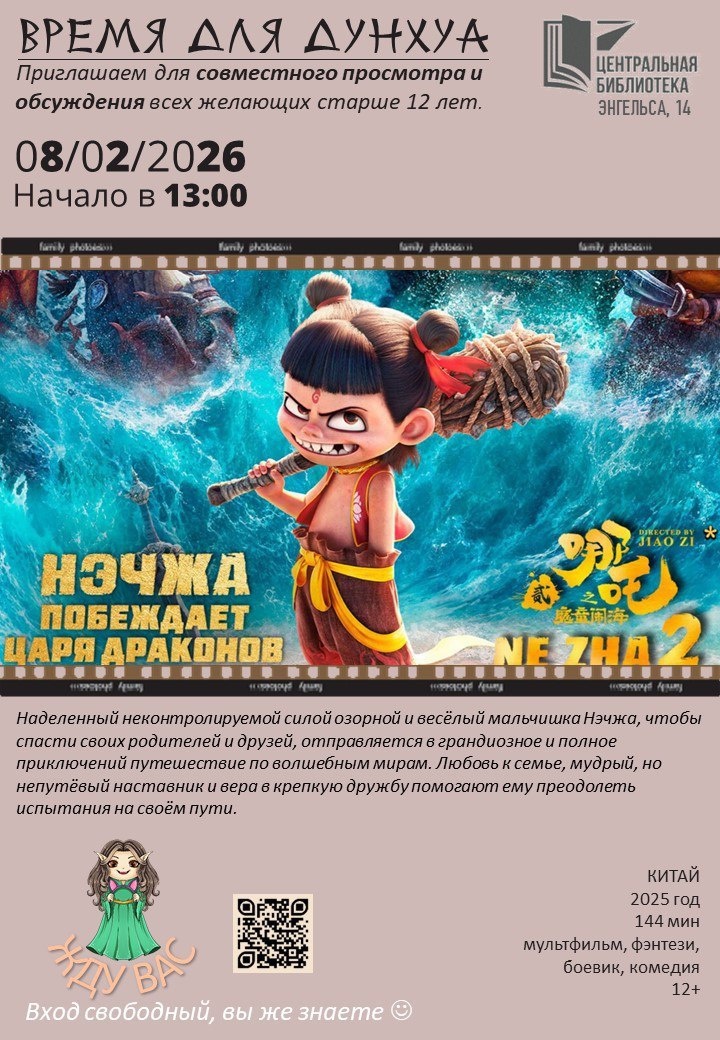 📽8 февраля в 13:00 Центральной библиотеке состоится совместный просмотр и обсуждение анимационного фильма «Нэчжа побеждает Царя драконов».