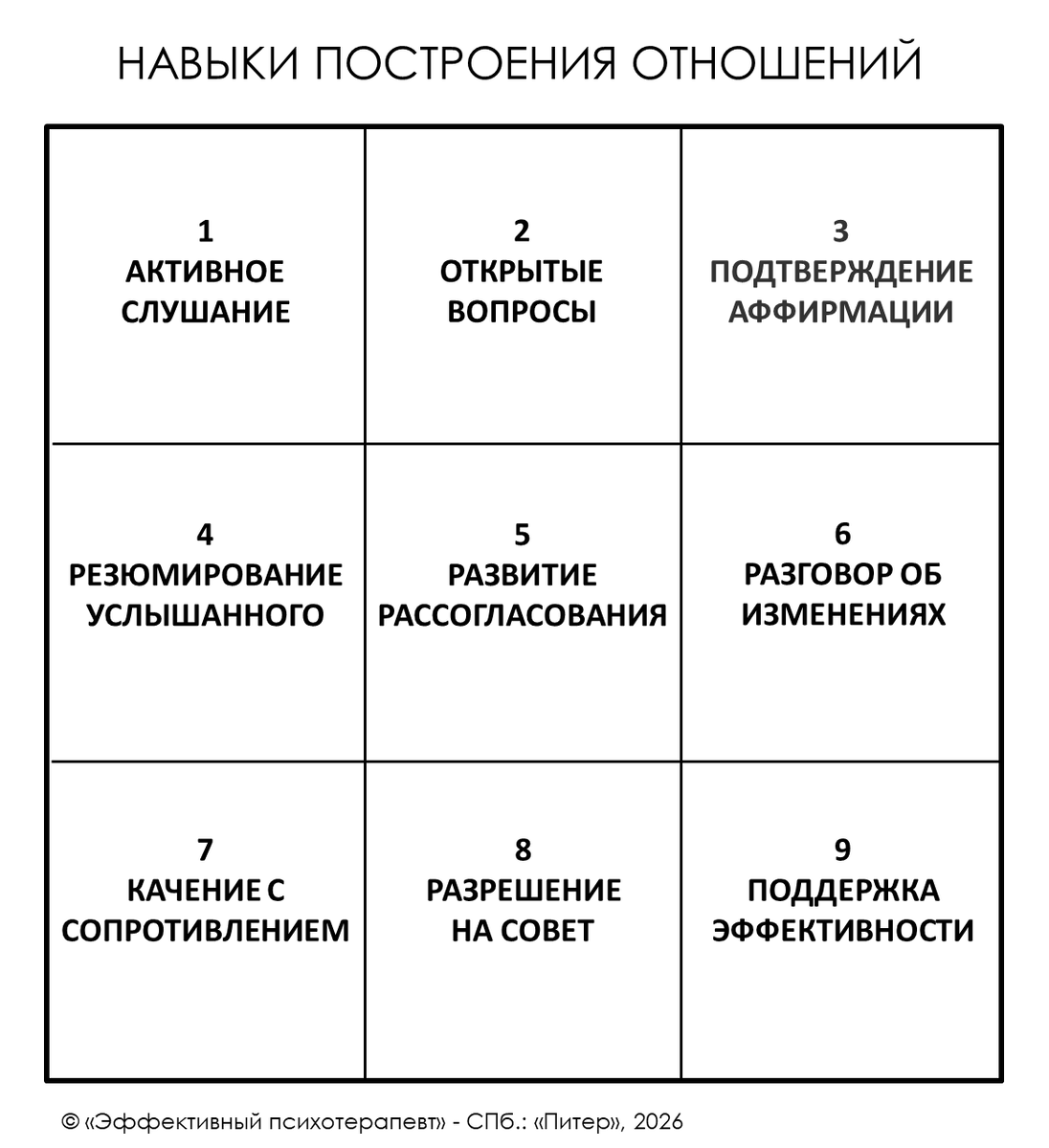 - Подтверждение (аффирмации) (50 слов): Признание сильных сторон, усилий и ценностей клиента укрепляет терапевтический альянс, повышает его самоэффективность и мотивацию. Это поддержка, которая помогает преодолеть уныние и поверить в возможность изменений.