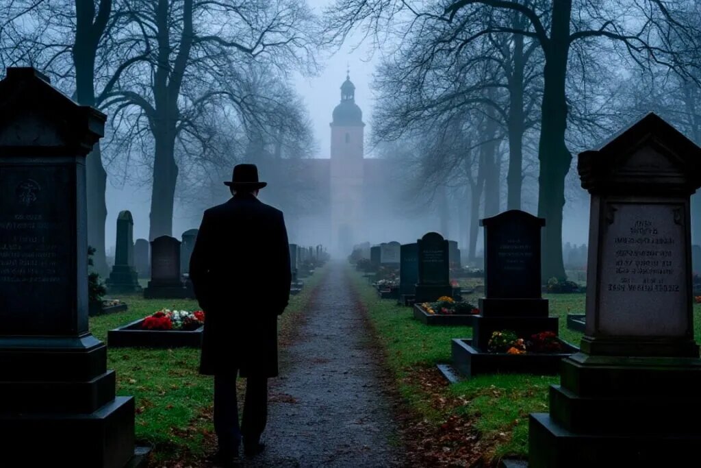 В ту ночь туман снова окутал Нюрнберг. На кладбище появился одинокий силуэт. Он двигался между надгробий, его глаза светились в темноте. Это был Каспар — или то, что от него осталось.