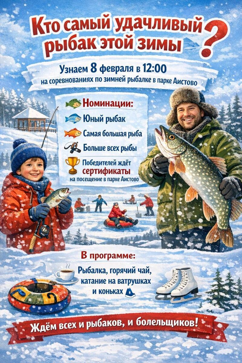 ? Встречаемся завтра в 12:00 в Аистово 🎣🐠⛸️ В программе: 🎣 зимняя рыбалка (удочку дадим в аренду) ☕ горячий чай 🛷 ватрушки ⛸️ коньки с собой А после, можно остаться и погреться: 🏡 домики 🔥 баня ♨️ горячий чан под открытым небом Вход свободный 👌🏻 Ждём всех и рыбаков, и болельщиков 💙 #зимняя@aistovowakepark#рыбалка