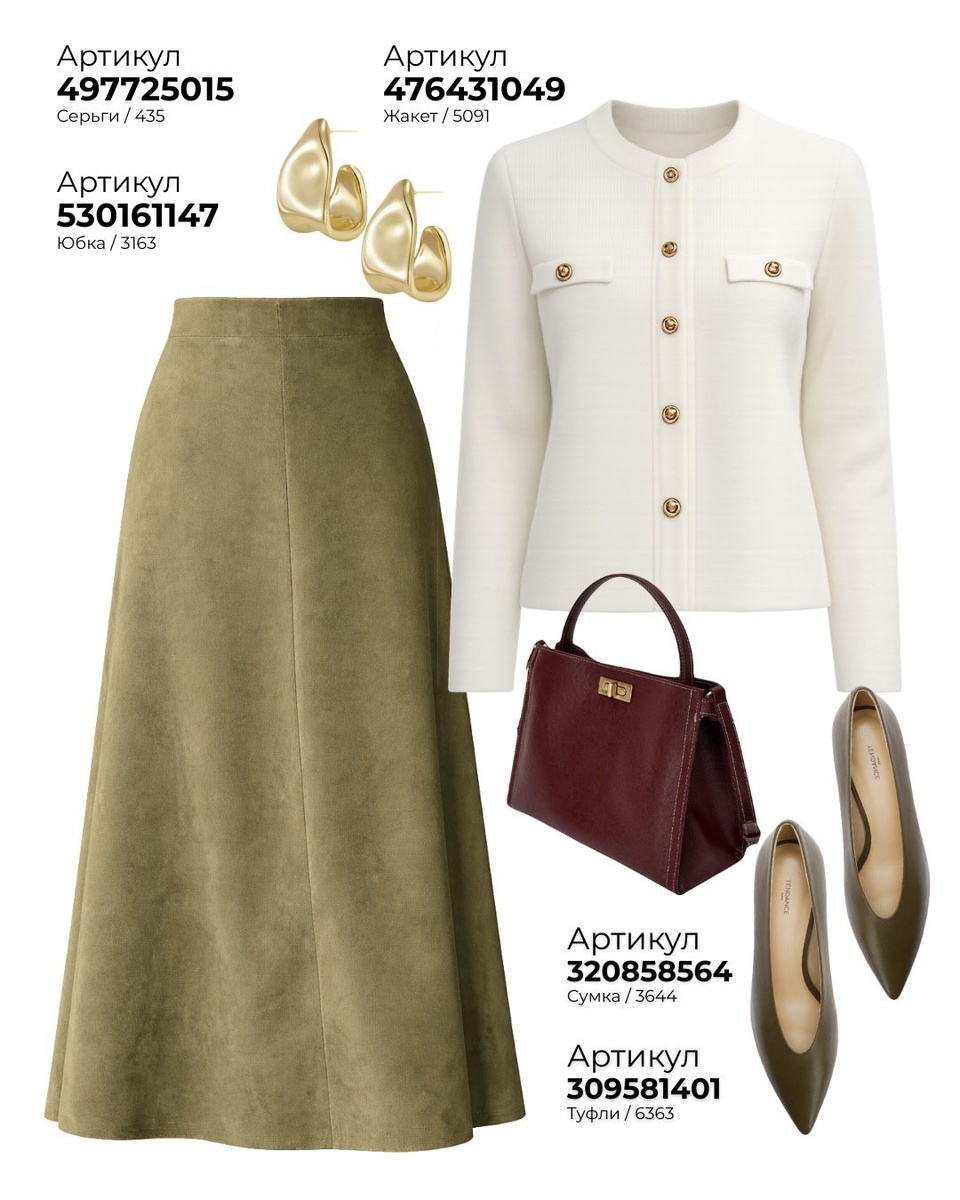 Эта подборка — настоящий мастер-класс по нюансам: молочный жакет освежает и собирает образ, оливковая юбка добавляет глубины и благородства, вишнёвая сумка делает комплект живым и «дорогим», а серьги и лодочки доводят всё до идеального баланса. Получается образ, который уместен почти везде — и при этом всегда смотрится так, будто вы точно знаете, что делаете.