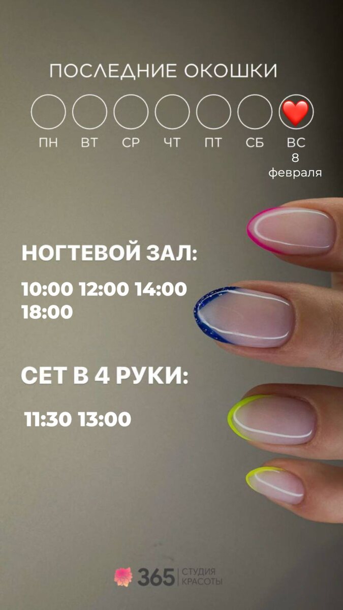 🤗🤍 Ждем Вас насладиться красотой и гармонией 🤍👐 Пусть отдых будет ярким и приятным! 🤍 #красота #наслаждение #забота #зима #любовь #мечты сбываются #радость #возможности ЧТО МОЖНО УСПЕТЬ СДЕЛАТЬ 08 февраля 2026 года : Ногтевой зал: 10:00 12:00 14:00 18:00 Сет в 4 руки: 11:30 13:00 Парикмахерский зал: ближайшая запись на 9 февраля Оформление бровей и ресниц: ближайшая запись на 10 февраля Косметология/шугаринг: 10:00 15:00 18:00 20:00 ЗАПИСАТЬСЯ МОЖНО ЛЮБЫМ УДОБНЫМ СПОСОБОМ: 👉🏻 Сообщение в Whats'app https://wa.me/79663654477 👉🏻По телефону +79663654477 👉🏻Онлайн запись https://n286444.yclients.com/ #команда365 #красота #наслаждение #забота #зима #январь #любовь #мечтысбываются #радость #возможности