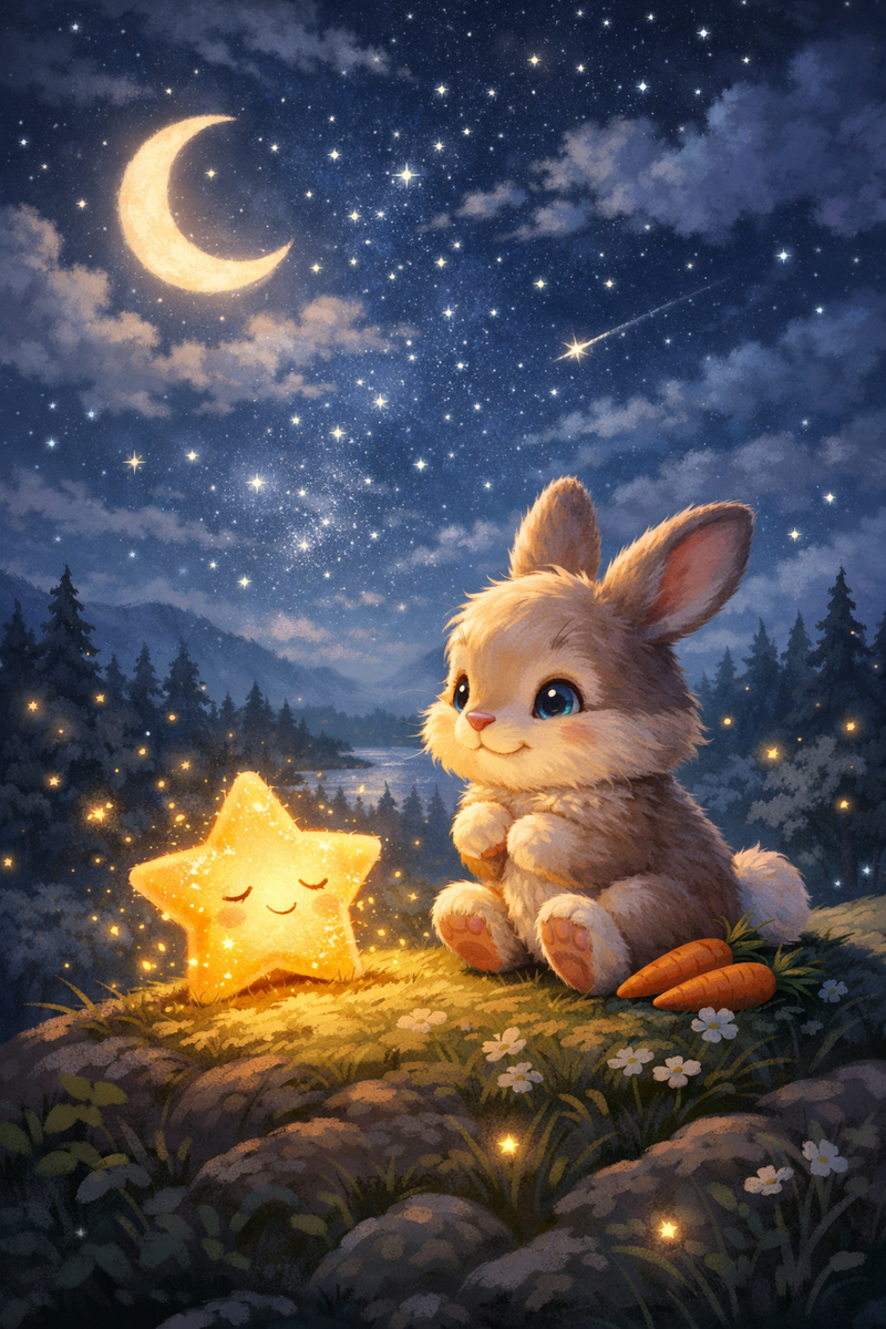 🌙 Звёздный зайчик. В одном тихом лесу, где деревья шептали колыбельные ветру, жил маленький зайчик по имени Лучик. Днём он был самым обычным зайцем — прыгал по полянкам и грыз сладкую морковку. Но как только на небе загорались первые звёзды, происходило настоящее чудо. Однажды Лучик заметил, что одна звёздочка светит совсем слабо.